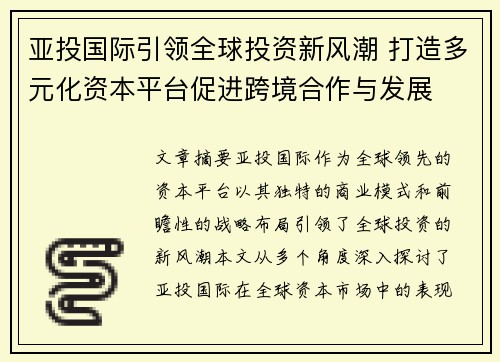 文章摘要:亚投国际作为全球领先的资本平台,以其独特的商业模式和前瞻性的战略布局,引领了全球投资的新风潮。本文从多个角度深入探讨了亚投国际在全球资本市场中的表现,分析了其如何通过创新的投资方式,打造多元化的资本平台,促进跨境合作与发展。文章首先概述了亚投国际的核心战略与全球布局,其次从创新投资模式、跨...